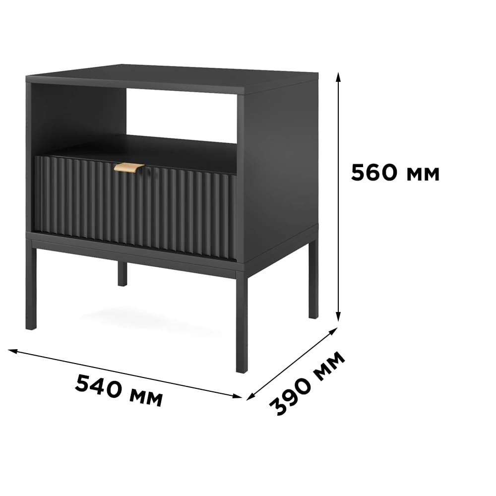 Корпус тумби виготовлений із ламінованої ДСП товщиною 16 мм, що забезпечує міцність, стійкість до зношування та приємний зовнішній вигляд, а фасад із рифленого МДФ товщиною 18 мм додає текстури та естетичного шарму. Поверхня має гладке покриття, яке створює комфортну атмосферу в спальні, а металеві ніжки висотою 20 см із порошковим покриттям захищені від корозії та подряпин. Телескопічні направляючі повного висуву дозволяють легко відкривати шухляду, забезпечуючи комфорт у повсякденному використанні.