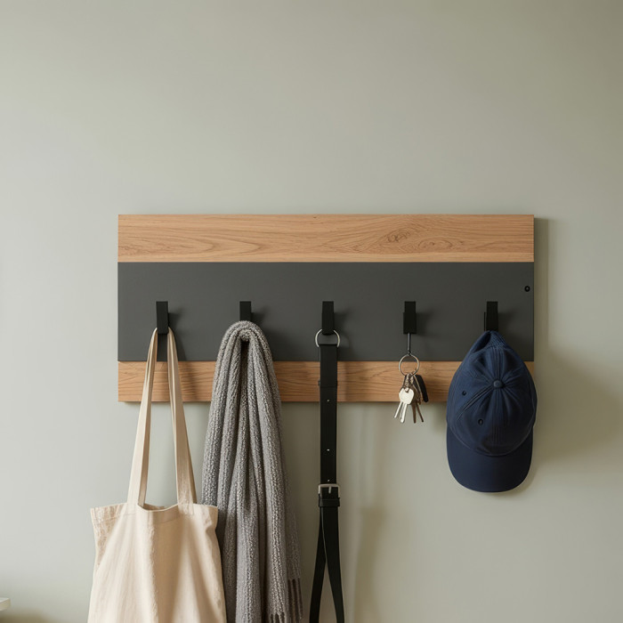 Настінна вішалка Еверест Нордік-800 з колекції «Нордік» — компактне і стильне рішення для організації простору в передпокої, коридорі або гардеробній зоні. Завдяки лаконічному дизайну і поєднанню контрастних відтінків модель гармонійно вписується в сучасні інтер'єри. Невелика глибина дозволяє використовувати вішалку навіть у вузьких приміщеннях, зберігаючи зручність і функціональність.