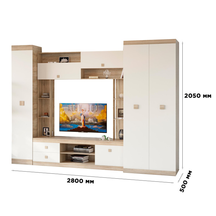 Модульна конструкція дає можливість переставляти елементи між собою, адаптуючи композицію під розміри і планування приміщення. Світле поєднання дуба сонома і білих фасадів візуально полегшує інтер'єр і гармонійно вписується в сучасний стиль вітальні.