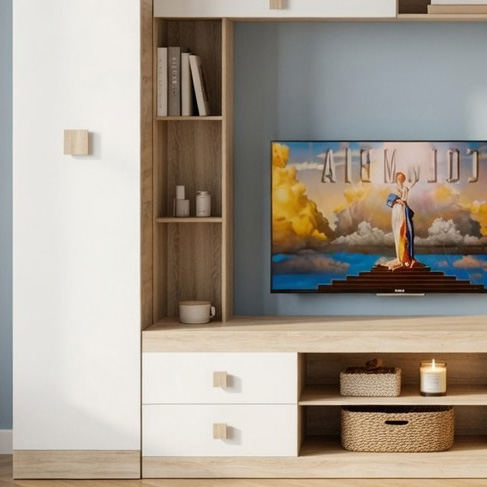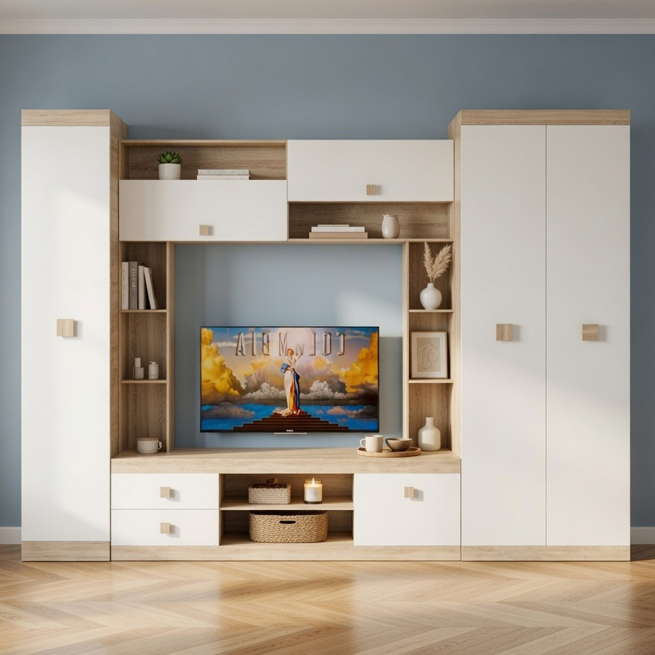 • Центральна стінка з функціональним наповненням – включає тумбу під телевізор, дві висувні шухляди та комбінацію відкритих полиць.