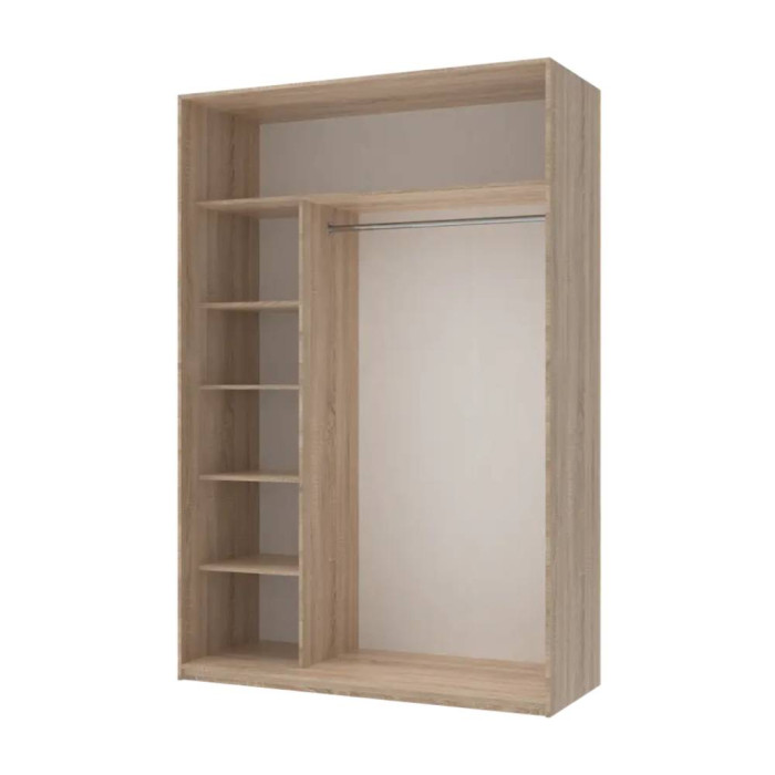 Усередині передбачено штанги для вішалок, що дозволяють зручно розміщувати одяг, а також полиці для акуратної організації речей та побутових аксесуарів. За бажанням шафа може бути доукомплектована висувними шухлядками для одягу чи зовнішнім кутовим закінченням у тон корпусу, що робить її ще практичнішою та універсальною у використанні.