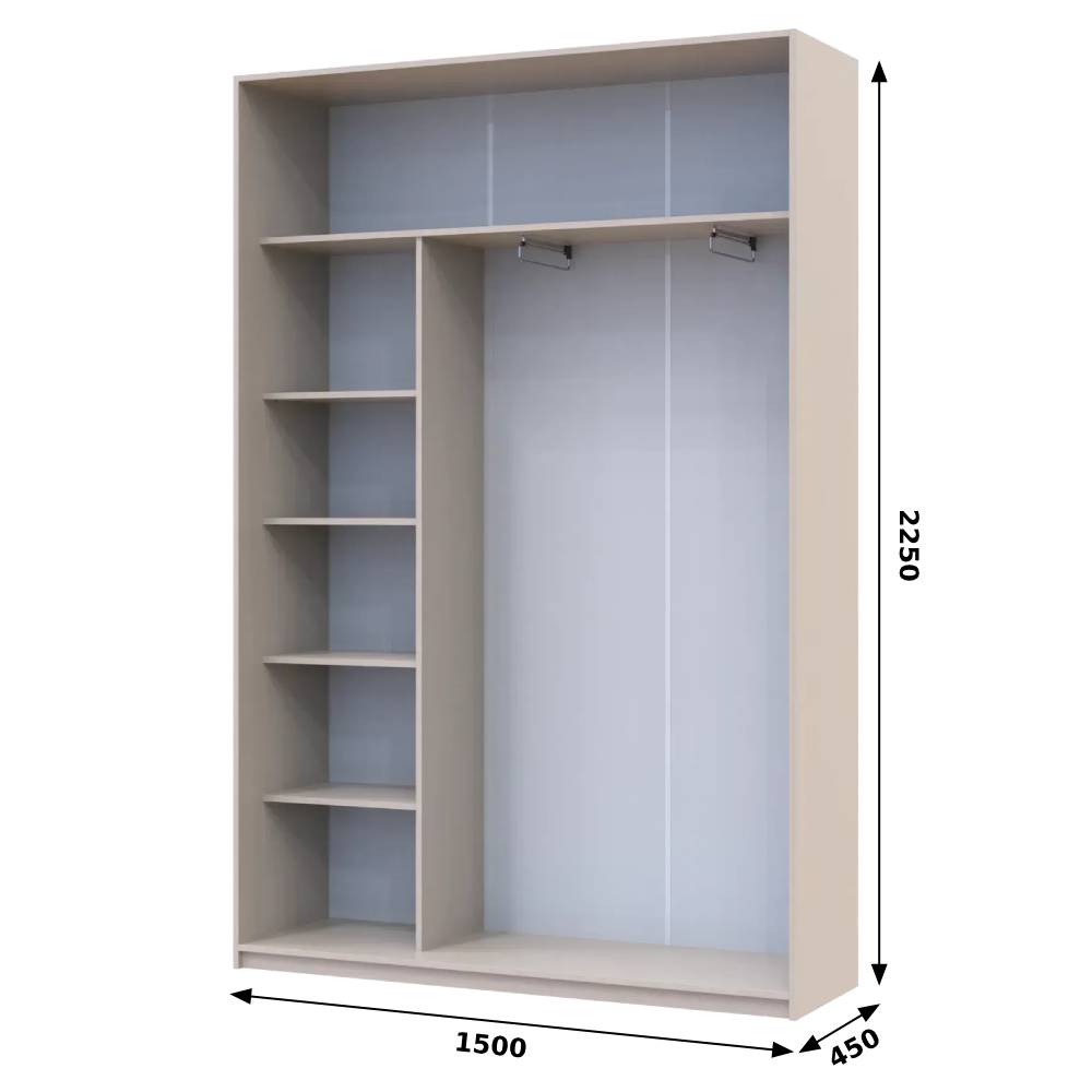 Усередині передбачено штанги для вішалок, що дозволяють зручно розміщувати одяг, а також полиці для акуратної організації речей та побутових аксесуарів. За бажанням шафа може бути доукомплектована висувними шухлядками для одягу чи зовнішнім кутовим закінченням у тон корпусу, що робить її ще практичнішою та універсальною у використанні.