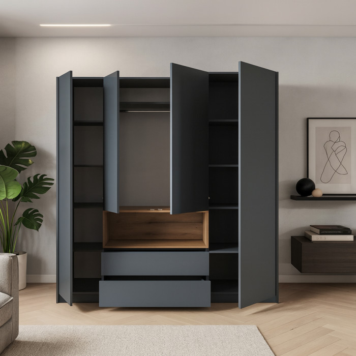 Шафа просто бомба! Дуже велика й містка – вистачає місця для всього. Особливо подобається стильний графітовий колір, виглядає сучасно й дорого. А дерев’яна ніша додає особливого шарму, робить шафу ще цікавішою.