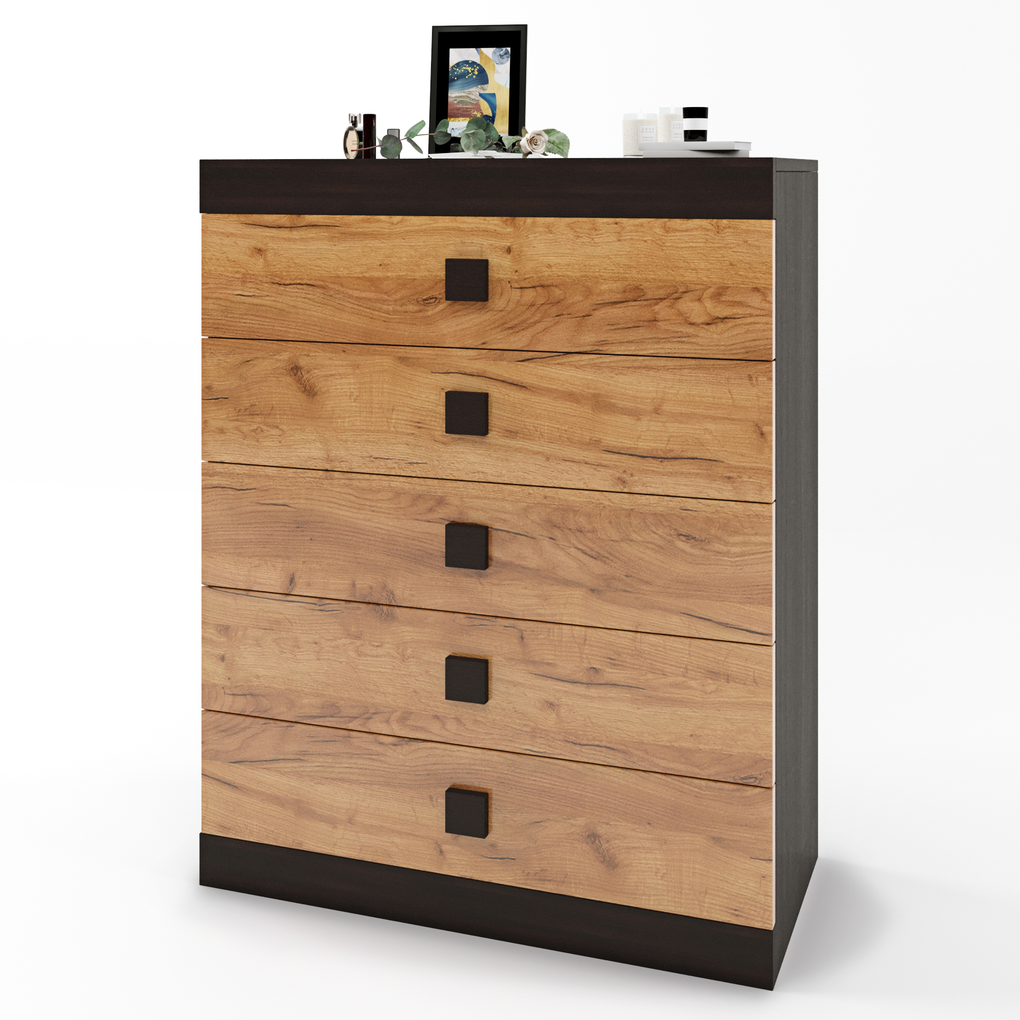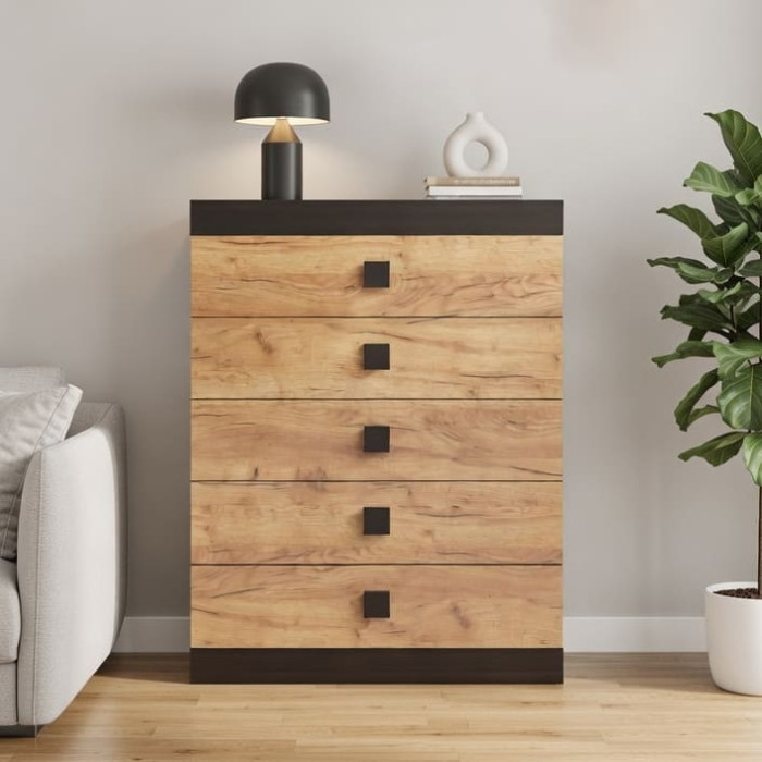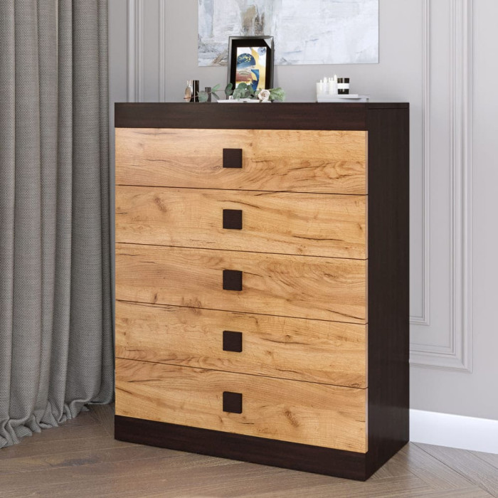 Комод виготовлений із високоякісного ламінованого ДСП, що відрізняється довговічністю та стійкістю до зовнішніх впливів. П'ять висувних ящиків оснащені направляючими повного висування, що забезпечує плавний рух та легкий доступ навіть до найвіддаленіших куточків системи зберігання.
